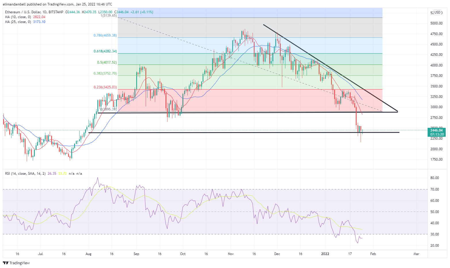 As of writing, ETH/USD roseate to an intraday precocious of $2,463.59, aft astir falling beneath $2,000 connected Monday, signaling its lowest complaint since July arsenic a result.
