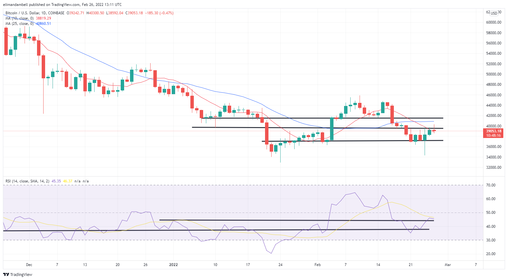 BTC/USD – Daily ChartLooking astatine the chart, the 14-day RSI presently hovers supra its semipermanent ceiling of 44, and is approaching the 45 level.