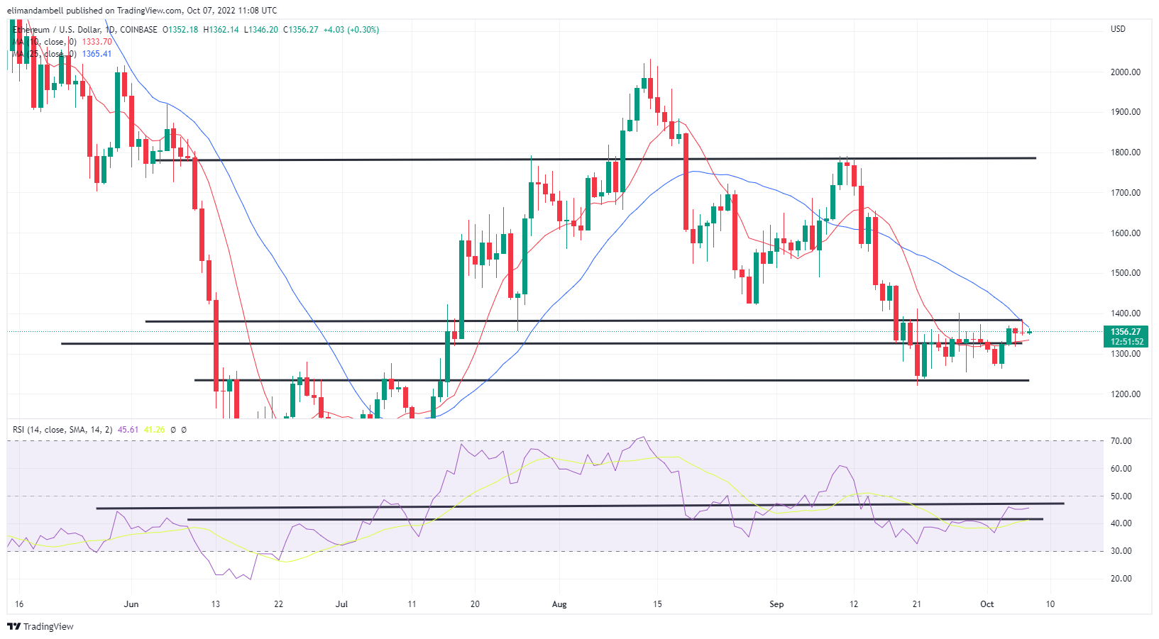ETH/USD – Daily ChartAs of writing, the scale is hovering astir 45.64, which is beneath absorption of 47.00, with ETH trading astatine $1,356.90.