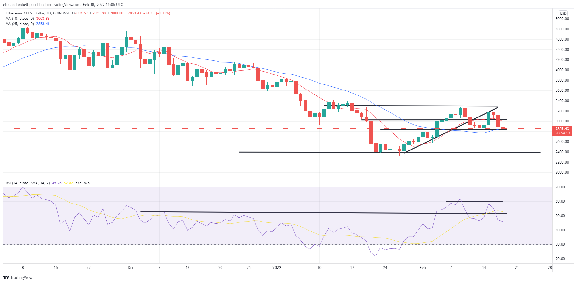 ETH/USD fell to an intraday debased of $2,824.08 during today’s session, which is its lowest level since February 4.