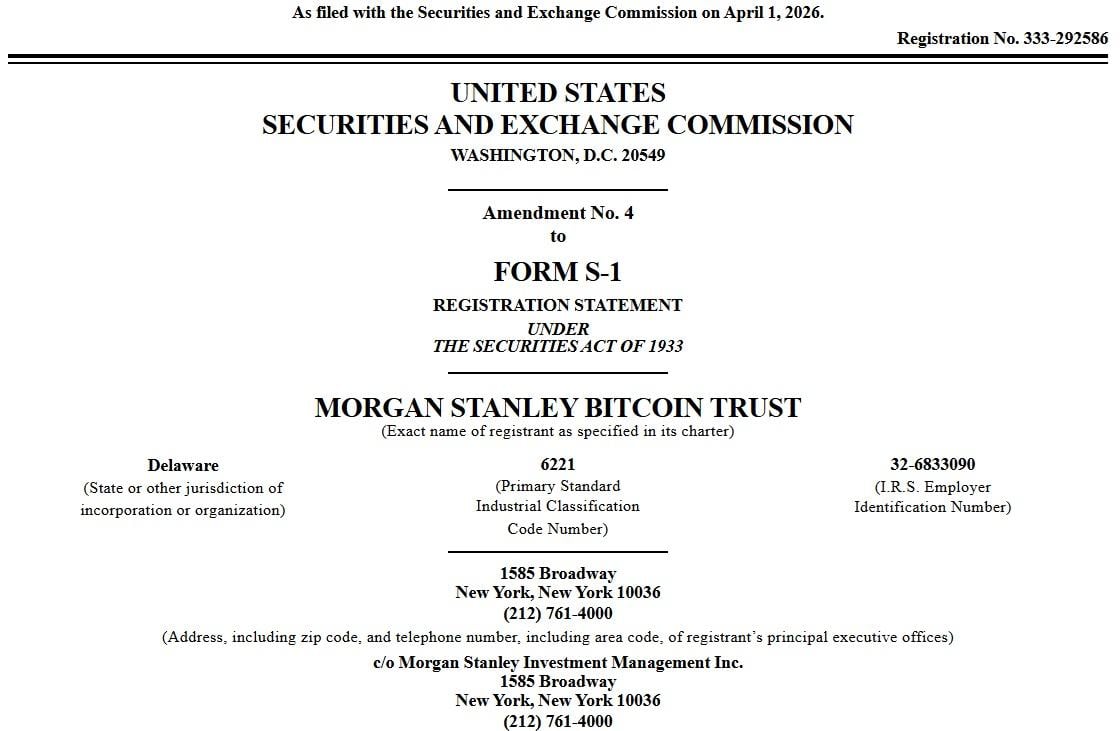 Morgan Stanley, a planetary concern slope and plus absorption firm, filed Amendment No. 4 to its Form S-1 registration connection with the U.S. Securities and Exchange Commission (SEC) connected April 1 for the Morgan Stanley Bitcoin Trust, outlining plans to database the bitcoin exchange-traded money (ETF) connected NYSE Arca nether the ticker MSBT. The filing describes a passive conveyance designed to way bitcoin’s terms show utilizing a benchmark index.