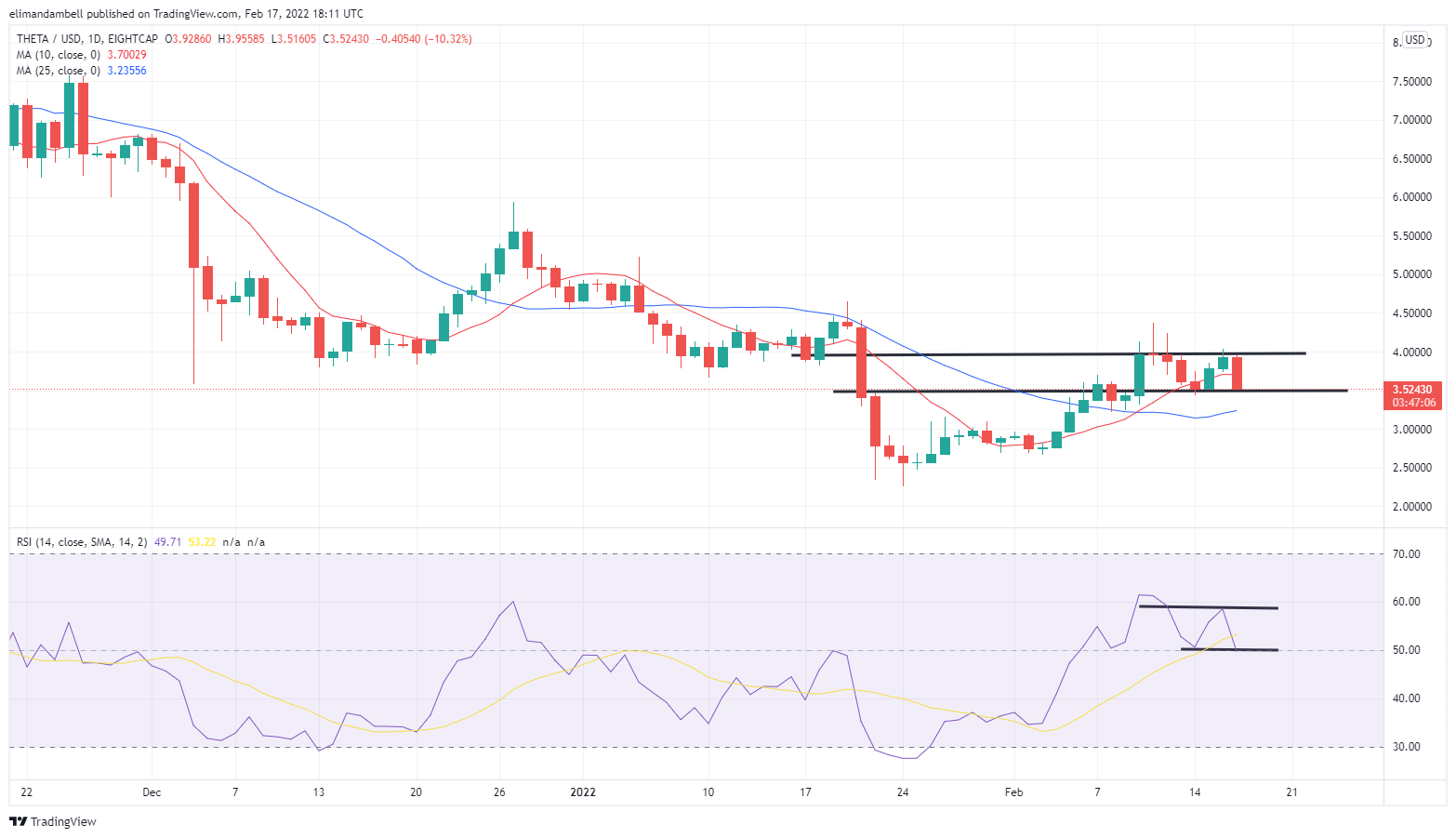 THETA/USD – Daily ChartPrice spot besides faded, with the RSI falling to its ain enactment of 50.20, aft being held up astatine absorption astatine 58.65.